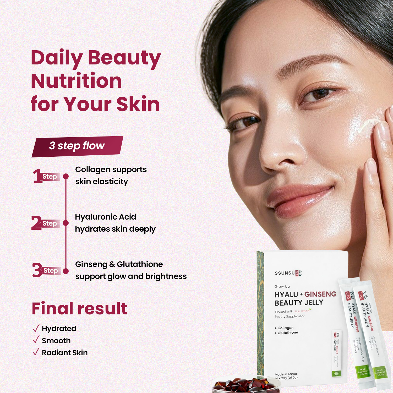 This beauty supplement jelly fits perfectly into modern skincare routines, combining Korean beauty inspiration with functional ingredients to support natural glow from within. Glow Up Hyalu Ginseng Beauty Jelly is carefully formulated in Korea using a blend of Korean Red Ginseng, Hyaluronic Acid, Glutathione, and Collagen to complement daily skin nourishment and hydration. With regular use, it helps support hydrated, plumper looking skin and a brighter, smoother appearance. The tasty Collagen jelly stick format makes daily consumption easy and enjoyable no pills or powders required. A simple and convenient addition to your Korean inspired skincare routine.